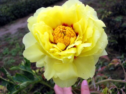 Древовидный пион Hai Huang (High Noon) махровый или полумахровый, диаметром до 16 см., с приятным, достаточно сильным ароматом, лепестки - могут иметь оттенки от насыщенно-жёлтого до светло-жёлтого, кроме того, у внутреннего основания лепестков может просматриваться небольшой красный оттенок,пыльники на тычинках - жёлтые. Высота 0.9-2м. Цветоносы крепкие. Листья крупные, сложные, дваждыперистые, летом - зелёные, осенью - приобретают красно-пурпурный цвет.