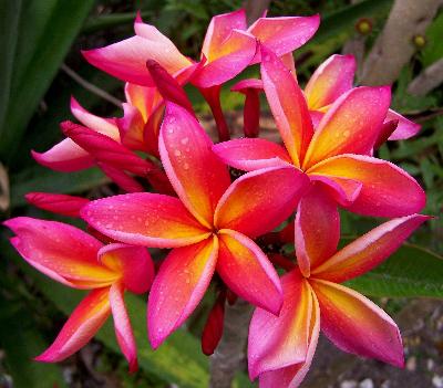 Plumeria Jeannie Moragne - декоративное цветущее растение. Листья насыщенно-зеленые, крупные, элпитические, заостренные. Цветки большие, диаметром 12-13 см, насыщенно-розовые с желтым оттенком у основания. Аромат сильный, фруктовый.
