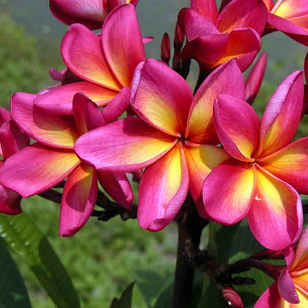 Plumeria Mermaid Gem - декоративное растение. Цветки средних размеров, 5-лепестковые, нежные, обладают приятным, мягким, сладким запахом. Лепестки продолговатые, длиной 4 см, насыщенно-розовые с большими желтыми пятнами от основания.