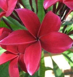 Plumeria Pops отличается насыщенно-розовыми, почти однородного окраса цветками. По краям лепестков присутствуют светло-розовые оттенки. Форма лепестков продолговатая, заостренная у кончика. Цветки 5-лепестковые. Молодые ветви бордовые.