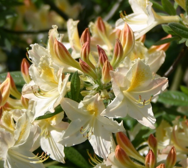 Рододендрон Daviesii - пряморастущий кустарник с раскидистой кроной. Листья зеленые. Цветки кремово-белые с желтыми крапинками. Цветет очень обильно. Предпочитает слабокислые почвы. Высота 1,5-2 м.
