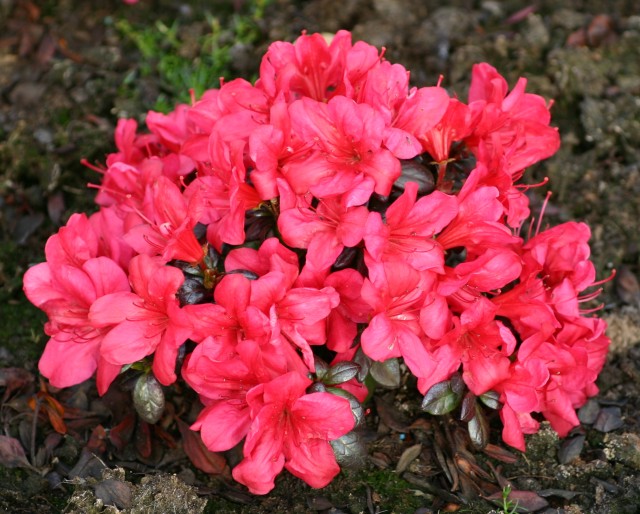 Саженцы азалии Марушка (Maruschka) – дают кустарники японского вида. Все чаще появляется в наших широтах эта восточная красавица. Ее яркость и компактность полюбились нашим садоводам. Эти небольшие (не более 50 сантиметров) кустики имеют подушкообразную форму, цветут в мае красными цветами. Растет азалия Марушка довольно медленно. Листочки темно-зеленые, блестящие, декоративные. Отцветшие цветы надо удалять. Любит растение: