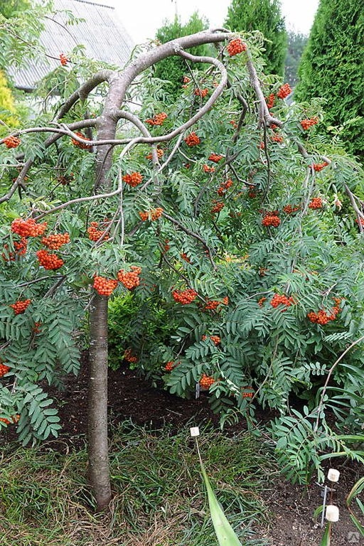 Это обыкновенная рябина, но с ниспадающими ветвями. В природе рябины имеют кудрявую крону - ветви приподнимаются. Прививка на высоте 1.8м даёт возможность получить у дерева кардинально другую форму кроны - с ниспадающими плакучими ветвями. Результат весьма привлекательный - дерево не вырастает большим как в природе, не выше 2-3м и ниспадающие ветви с красиво разрезанной листвой очень украшают сад. По всем остальным качествам плакучая рябина обыкновенная, т.е. цветёт кремовыми крупными шапками, потом к осени даёт оранжево-красные плоды. Рябина обыкновенная с прививкой очень пластична. По своему желанию Вы можете отгибать ветви в нужном направлении, подстригать, стричь вершину и прочее. Главное - это не подстригать слишком много сразу, дерево может ослабнуть.Зимуют без укрытия.