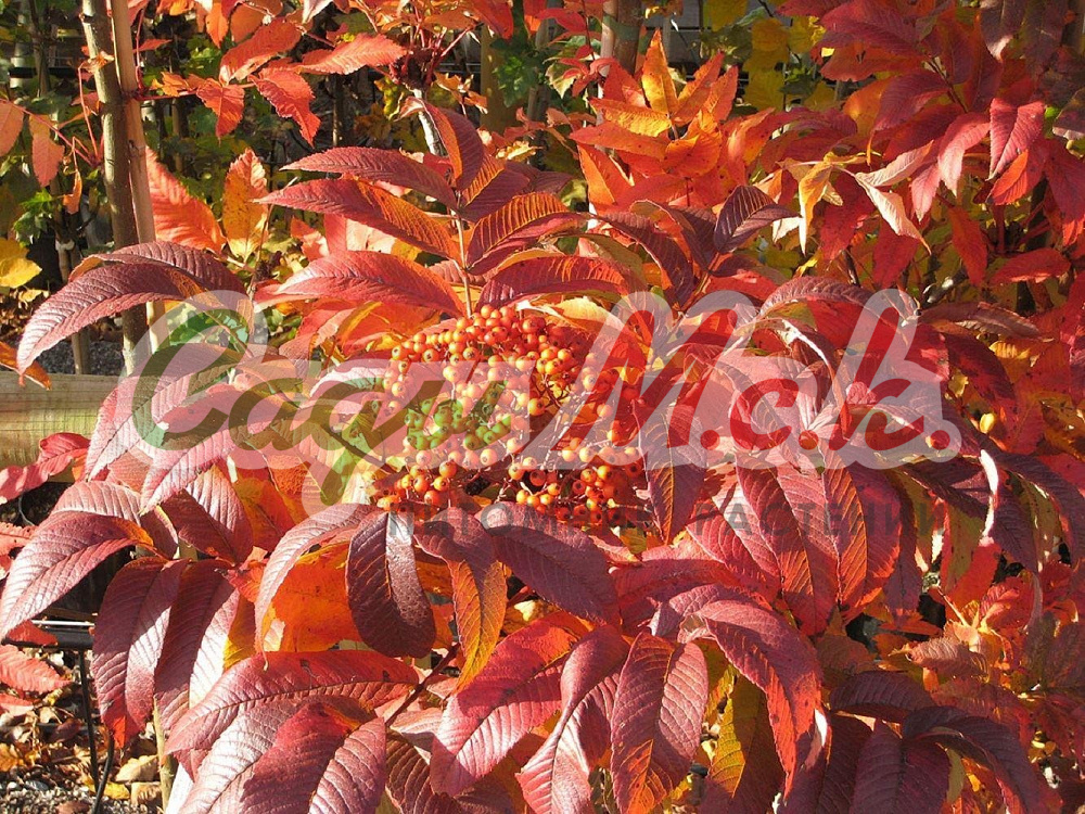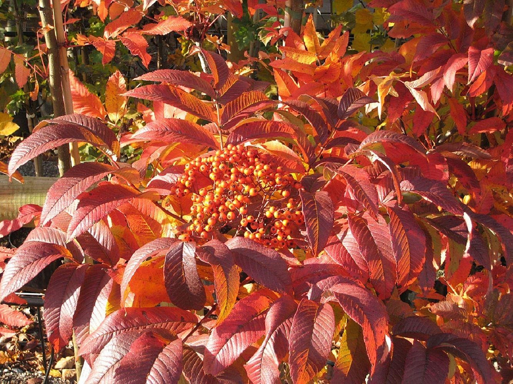 Кора имеет темно -серый цвет , а побеги очень толстые, с крупными ( 1-2 см), темно – красными, липкими смолистыми зимними почками . Листья самые крупные у любой рябины, темно -зеленые с рельефными прожилками сверху, сизые снизу, 20-35 см длиной и 15-20 см шириной. В середине осени они изменяются от насыщенного оранжево-розового до фиолетового или темно -красного цвета .