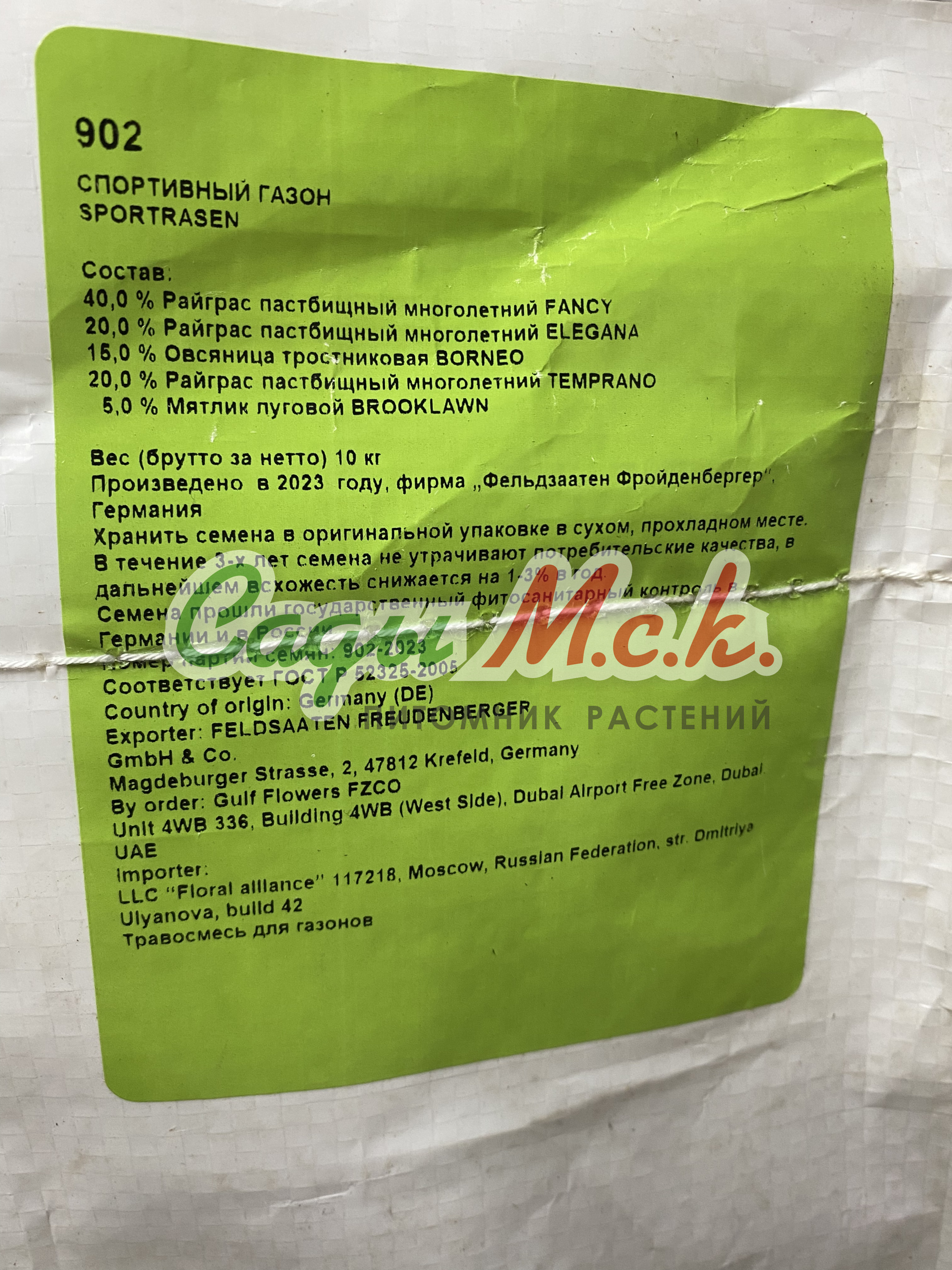 Состав: 40% Райграс пастбищный многолетний FANCY, 20% Райграс пастбищный многолетний ELEGANA, 15% Овсяница тростниковая BORNEO, 20% Райграс пастбищный многолетний TEMRANG, 5% Мятлик луговой BROOKLAWN. Производитель: Фельдзаатен Фройденбергер (FELDSAATEN FREUDENBERGER). Страна: Германия. Дата производства: 2023 г.