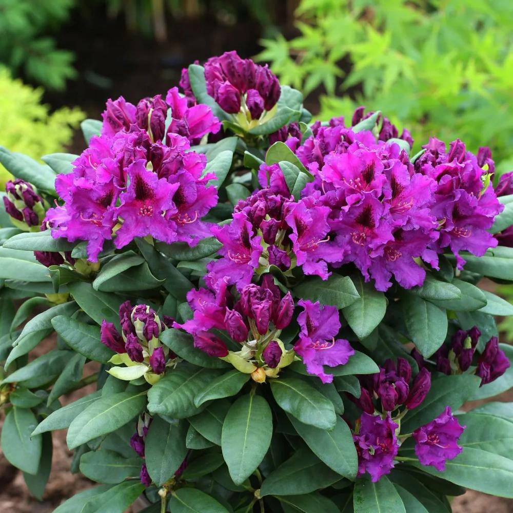 Рододендрон Azurro - куст около 100 см высотой. Цветки темно-фиолетовые с красно-фиолетовым пятнышком, лепестки с волнистыми краями. Зимостойкость до -23°С.