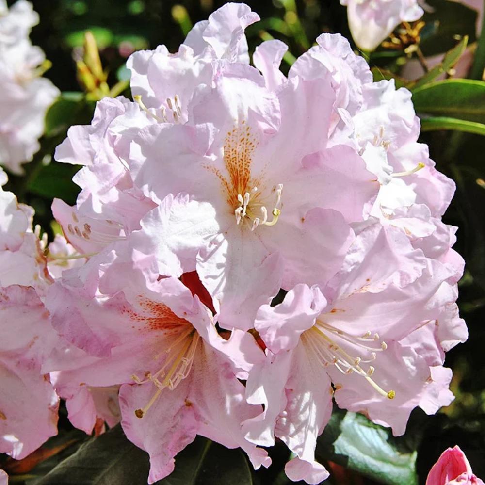 Рододендрон Dagmar - вечнозеленый кустарник. Листья крупные, красивые, цветки - очень эффектные, бело-розовые с золотисто-желтым горлом, гофрированные по краю, в больших соцветиях до 15 цветков. Цветет в мае, в тёплую погоду имеет лёгкий, приятный аромат.
