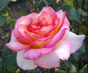 Роза Bella Vita - цветок крупный, махровый (35-40 лепестков), бледно-розовый с темно-розовой каемкой, бокаловидной формы. Диаметр цветка 14 см. Листья зеленные и блестящие. Куст мощный, прямой, высотой до 80-90 см. Морозостойкий сорт.