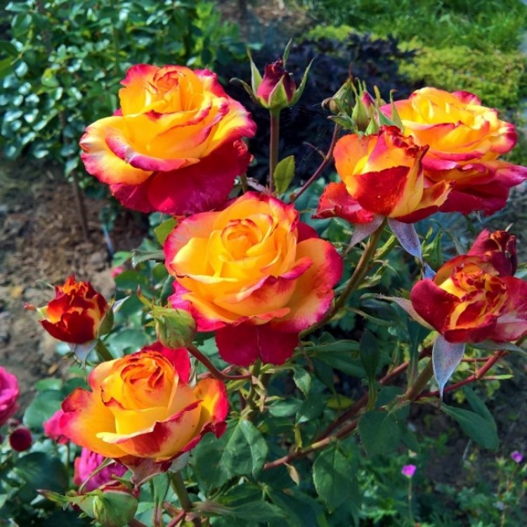 Circus - цветки медно-желтые в центре, к краям лепестков лососево-розовые, при отцветании усиливается красный тон, чашевидные до открытых, крупные (7—8 см), махровые (37—40 лепестков), слегка душистые, в соцветиях по 3—10, на цветоносах 50—60 см длиной. Листья обильные, темно-зеленые с бронзовым налетом, кожистые, блестящие, здоровые. Кусты 80 см высотой, пряморослые, густые. Цветение обильное. Сорт зимостойкий.