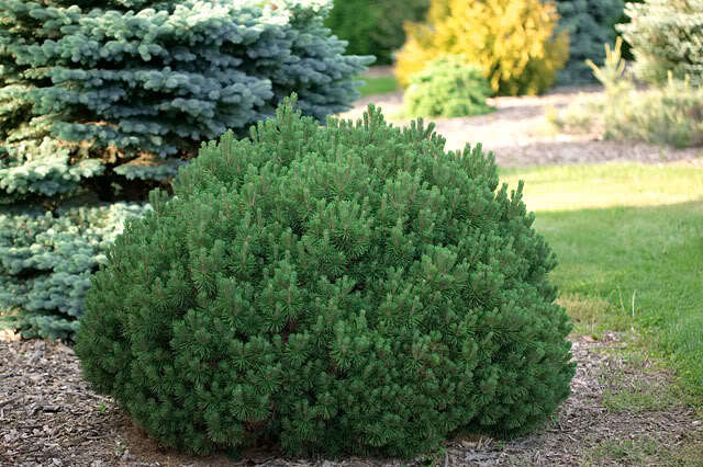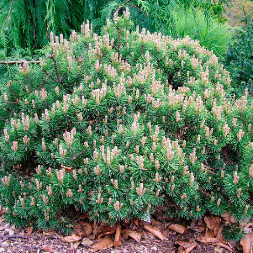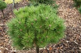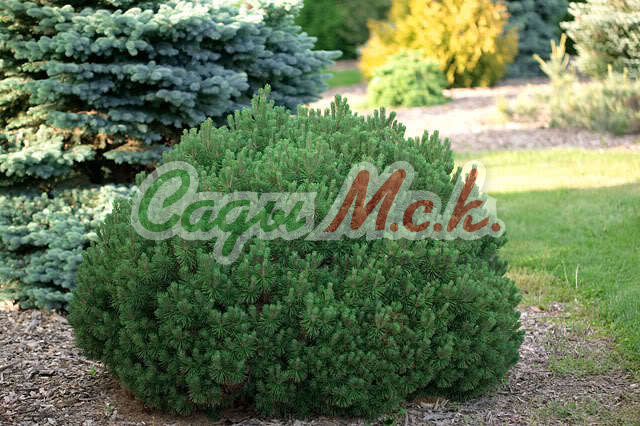Карликовая закругленная форма, одинаковой ширины и высоты. Высота - 1,5 м и такого же диаметра. Побеги очень короткие. Почки расположены плотно, различной величины, 1 - 2 см длиной, тонкие, коричневые, смолистые. Крона шаровидная. Хвоя на молодых побегах почти прямая, 2 - 4,5 см длиной и до 2 мм шириной, темно-зеленая. Растет медленно и очень густо ветвится. Размножают прививкой
