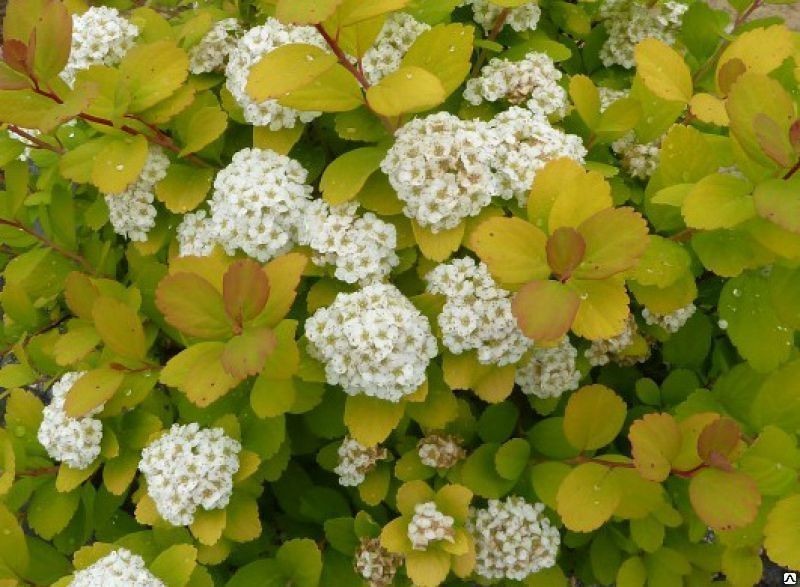 Куст компактный, высотой до 100 см. Крона шаровидная, густая. Цветет обильно в середине лета 25-26 дней. Щитковидные соцветия белого оттенка. Декоративность кустов состоит во впечатляющих оттенках осенних листьев. Летом листва сорта светлая, желто-салатовая. С августа листья приобретают яркие нюансы желтого, оранжевого, красно-багряного, даже пурпурно-фиолетового цвета.