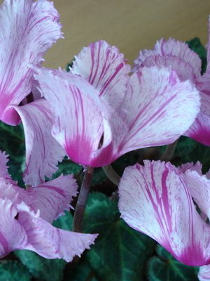 Цикламен персидский Хельга - Многолетнее клубневое растение семейства Первоцветные. Цветки очень ароматные, цветонос достигает длины 15 -20 см. Цветет с поздней осени до конца апреля, летом находится в состоянии покоя. Оптимальный срок посева конец августа. Семена перед посевом замачивают на сутки в теплой воде, а затем высевают в горшки с листовой и торфяной землей(1:1).Сверху семена присыпают слоем земли 0,5-1см, обильно поливают, накрывают темной пленкой. При t 20°C всходы появляются через 30-40 дней. После появления всходов притенение снимают, температуру снижают до 15-17 °C. Когда образуются маленькие клубеньки с двумя листочками, пикируют в ящики со смесью из листовой, торфяной земли и песка (2:1:0,5). При пересадках у молодых растений верх клубенька должен находиться у самой поверхности почвы (не глубже 0,5 см). У взрослых растений верх клубня обычно открыт. В период покоя сбрасывает листья. Выращивают на северных и восточных окнах, на южном притеняют от прямых солнечных лучей. Зимой содержат на светлом месте при температуре не выше 8 - 10 градусов. Летом необходимо выполнять приемы по поддержке роста растений: поливать исключительно через поддон, опрыскивать водой комнатной температуры, удобрять. Удобряют не более 2-3 раз за лето, преимущественно азотно-калийными удобрениями.