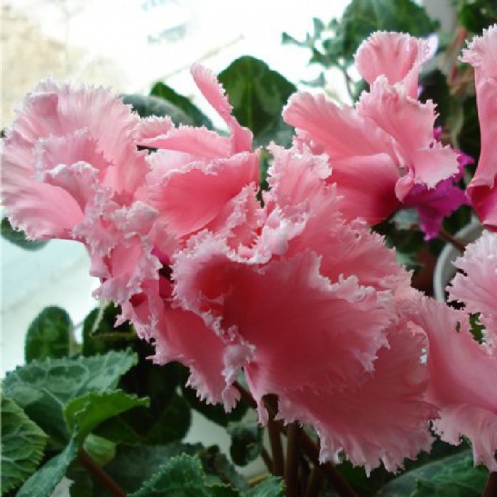 Цикламен персидский Лулу - Многолетнее клубневое растение семейства Первоцветные. Цветки светло-лиловые, очень ароматные, цветонос достигает длины 15 -20 см. Цветет с поздней осени до конца апреля, летом находится в состоянии покоя. Оптимальный срок посева конец августа. Семена перед посевом замачивают на сутки в теплой воде, а затем высевают в горшки с листовой и торфяной землей(1:1).Сверху семена присыпают слоем земли 0,5-1см, обильно поливают, накрывают темной пленкой. При t 20 °C всходы появляются через 30-40 дней. После появления всходов притенение снимают, температуру снижают до 15-17 °C. Когда образуются маленькие клубеньки с двумя листочками, пикируют в ящики со смесью из листовой, торфяной земли и песка (2:1:0,5). При пересадках у молодых растений верх клубенька должен находиться у самой поверхности почвы (не глубже 0,5 см). У взрослых растений верх клубня обычно открыт. В период покоя сбрасывает листья. Выращивают на северных и восточных окнах, на южном притеняют от прямых солнечных лучей. Зимой содержат на светлом месте при температуре не выше 8 - 10 градусов. Летом необходимо выполнять приемы по поддержке роста растений: поливать исключительно через поддон, опрыскивать водой комнатной температуры, удобрять. Удобряют не более 2-3 раз за лето, преимущественно азотно-калийными удобрениями.
