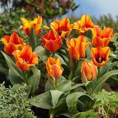 Тюльпан Compostella - многолетнее луковичное растение семейства лилейные. У растения травянистый прочный и прямостоячий стебель, на котором расположены цветки и пикоподобные листья. Высота растения до 35 сантиметров. Зелёные листья расположены поочередно, вдоль листьев хорошо просматриваются дугообразные прожилки. Цветки бокаловидной формы. Лепестки по краям желтые, ближе к центу насыщенно-оранжевые. Основание - темно-оранжево-красное.