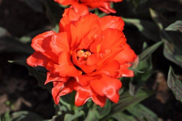 Тюльпан Dubbele Roodkapje (Double Red Riding Hood) относится к махровым цветкам позднего срока цветения. Зацветает тольпан в апреле. Длина стебля до стигает 30 см. Окрас цветков однотонный, оранжево-красный. Краи лепестков блестящиеся, волнистые. Стебли светло-зеленые, листья очень крупные, широкие, длинные, со светлыми и темно-бордовыми прерывающимся полосами.