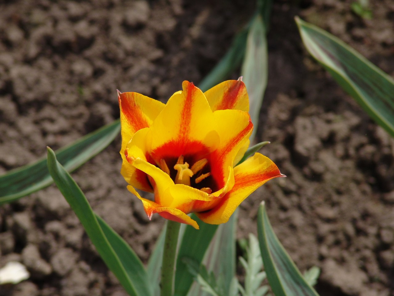 Тюльпан Cape Cod - изысканный сорт высотой 5-15 см. Цветок чашевидный, абрикосовый с желтым окаймлением по краю заостренных лепестков, внутри бронзово-желтый, центр черный с красными мазками, длиной до 8 см. Цветет до 10 дней. Листья с фиолетовыми штрихами.