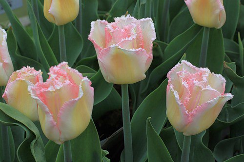 Тюльпан Lindzheri - бахромчастый сорт. Цветок кремово-желто-розовый, ближе к краям лепестков с белым оттенком. Бахрома короткая, густая, нежно-розовая. Стебли крупные, средней высотой 55 см. Окрас листьев и стебля изысканно-зеленый. Сорт цветет в апреле-мае.