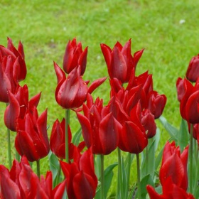 Тюльпан Pieter de Leur - травянистый многолетник, относится к классу однодольных растений семейства лилейных. Высота растения 25-35 см. Стебель окутан четырмя удлиненными, зелеными листьями. Цветок неприхотливый, элегантный, крупный, звездчатый, состоящий из 6 лепестков, лилиецветный, темно-красный, с заостренными кончиками лепестков. Период цветения - апрель-май.