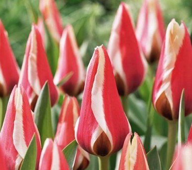 Тюльпан Chanson d Amour - сверхранний невысокий тюльпан с оригинальными цветками и расписными листьями. Цветет в марте. Форма цветка конусоподобная. Окрас лепестков красный, с кремовой каймой. Длина стебля - 30 см.