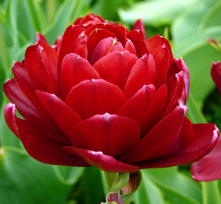 Тюльпан Uncle Tom относится к классу махровых поздних тюльпанов. Цветок является не слишком большим, а сам тюльпан - не слишком высок. Цветоносы, достаточно крепкие, высотой до 45 см. Его цветки размером от 8 до 10 см в диаметре (в раскрытом виде) обладают приятным ароматом. Каждый цветок состоит из 18-20 лепестков. Окрас лепестков насыщенно красный, с более темной полосой посередине лепестка и почти белым кончиком. Цветение продолжительное, до трех недель.Время цветения – конец апреля - май. Этот сорт идеален для срезки. Красиво смотрится в регулярных посадках на клумбах или в контейнерах.