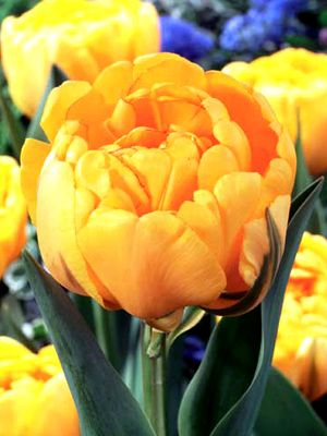 Тюльпан Yellow Pomponette - потрясающе солнечный тюльпан с крупными махровыми цветками пионовидной формы. Окрас цветка ярко-желтый, с оранжевым оттенком у основания лепестков. Высота цветконоса составляет 40 см. Листья темно-зеленые. Это сорт позднего срока цветения.
