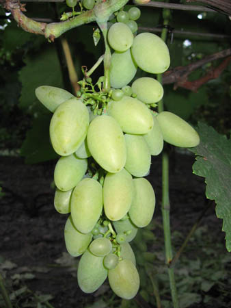 Саженцы винограда плодового Элегант – это сверхранний сорт великолепного по своим вкусовым качествам продукта садоводческого хозяйства. Период окончательного созревания составляет 100-110 дней от распускания почек. Виноградный крупномер Элегант имеет средне- или слаборослые кусты, а также обоеполые цветки. Кисти цилиндроконической формы, слегка плотные, крупные (масса грозди 300-500 г). Виноградины большие (29х20 мм) сосковидные или овальные, бледно-зеленые. Обладают гармоничным мускатным вкусом. Достоинства сорта: побеги вызревают хорошо; совместим со многими подвоями; устойчив к морозам, серой гнили и милдью.