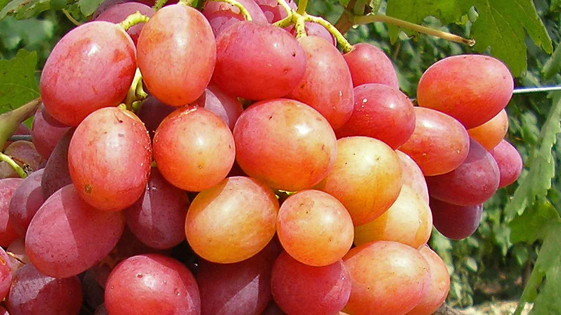 Сильнорослые кусты винограда обрастают привлекательными гроздями высокого товарного качества. В зависимости от погодных условий, на которые приходится период вызревания лозы, вес каждой кисти может достигать 700 – 1300 г. Ягоды у сорта винограда Анюта крупные. Овальные виноградины насыщенного темно-розового цвета достигают 15 г веса Послевкусие плоды оставляют приятное, сравнимое с легким мускатом. Кожица хоть и плотная, но съедаемая. Мякоть с 4-мя косточками мясисто-сочная и плотная. Но горошению гибрид не подвержен. Сорт устойчив к серой гнили и оидиуму