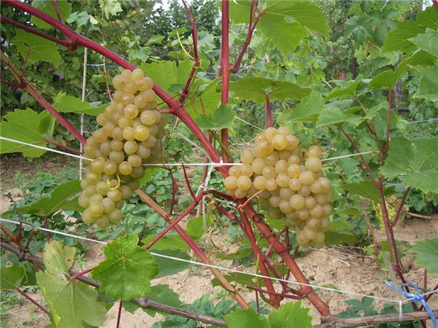 Гроздья цилиндро-конической формы и умеренной плотности. Овальные средние ягоды покрыты пуриновым налетом, белого или желтовато-зеленого цвета. Обладают приятным вкусом.
