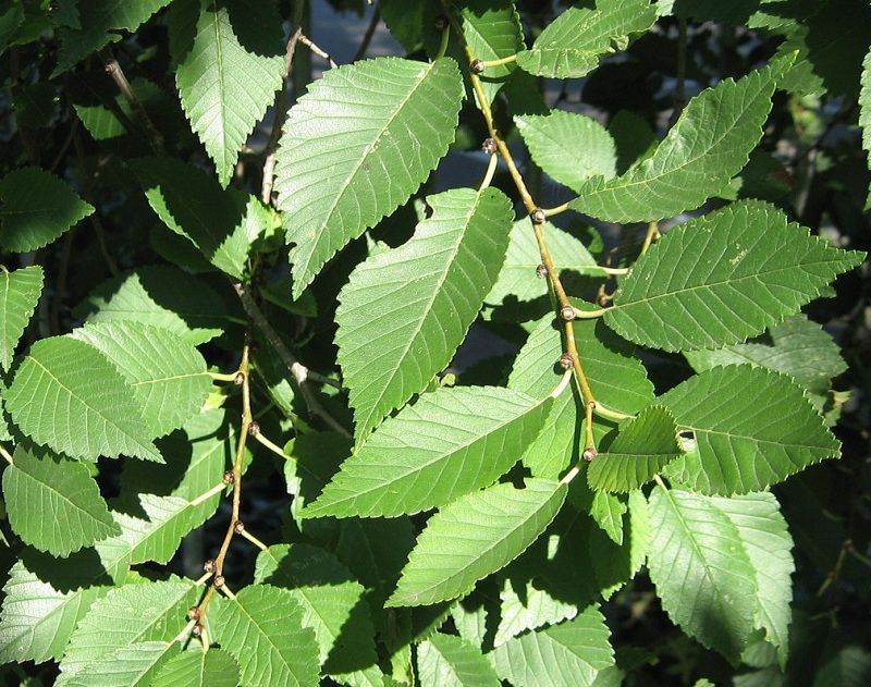 Листья эллиптические, яйцевидные или обратно-яйцевидные, в длину 2—5 см, тупые или острые, с неравнобоким основанием, зубчатые, сверху гладкие, блестящие, снизу опушённые, в зрелом возрасте почти кожистые, на черешках длиной 2—6 мм. В более мягком климате листья остаются на деревьях; в районах более холодных дерево становится листопадным.