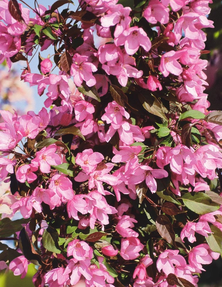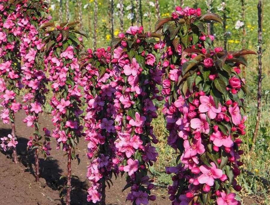 Саженцы яблони декоративной колоновидной Розовая сказка формируют сильнорослые колонны. Их предназначение является декоративным, они будут являться отличным украшением для любого сада. На колонне завязываются крупные соцветия с большими лиловыми бутонами, срок цветения - средний. У этого сорта отсутствуют оголения, имеется небольшое количество боковых ветвей. Листья яблони крупномера темно-зеленые с матовым блеском. Плоды маленькие приятного розового оттенка, имеют глянцевый блеск. На вкус они кисло-сладкие, немного вяжут во рту. Яблоня Розовая сказка не боится морозов и резких перепадов температур.