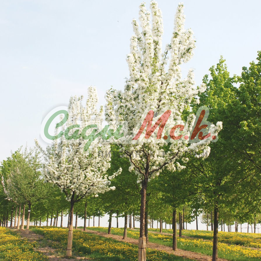 Саженцы яблони декоративной Профессор Шпренгерм привлекают к себе внимание весной эффектными белоснежными соцветиями. Данный сорт очень обильно плодоносит, его яблоки могут храниться всю зиму и при этом не испортиться. В среднем высота дерева составляет четырех с половиной метров, Красивая пышная крона в период цветения усыпана розовыми бутонами, которые, распускаясь, становятся белыми. Соцветия данного крупномера очень ароматные, плоды насыщенного яркого красного цвета долго не опадают с дерева. Этот сорт отличается своей морозоустойчивостью, поэтому зачастую его выбирают садоводы средней полосы нашей страны.