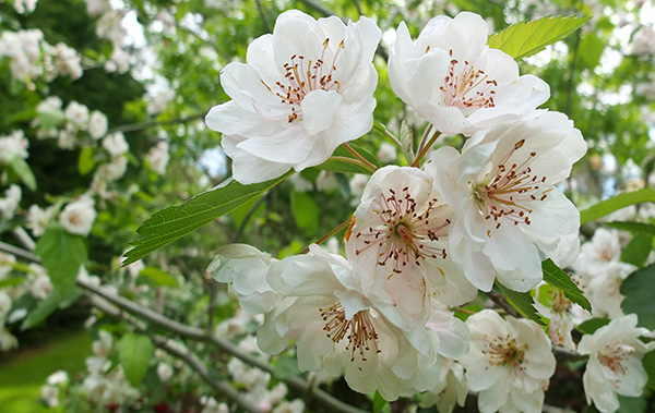 Яблоня Charlotta - листопадный, крупный кустарник или небольшое дерево с широкораскидистыми сильными ветвями. 5-7 м высотой и 4-6 м шириной. Годовой прирост в высоту и ширину 30 см. Листья расположены поочерёдно, широкие, яйцевидные или продолговатые, слаболопастные, на длинных побегах сильнолопастные, часто с каждой стороны по 3-4 лопасти, верхняя сторона блестящая, зеленая, с нижней стороны с белым опушением, осенняя окраска оранжево-красная. Плоды плоско-округлые, диаметром 4 см, зеленоватые. Цветение: розово-белые, полумахровые, диаметром 5 см, почки розовые с пастельно-красными жилками, расцветает поздно. Обладает запахом фиалок.