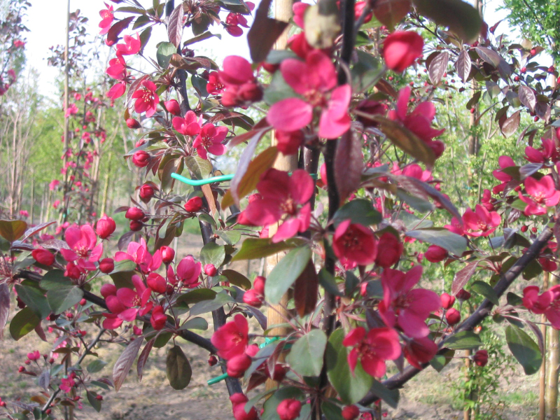 Саженцы яблони Скарлет используются многими садоводами в качестве украшения ландшафта. Данный сорт отлично вписывается в аллеи, композиции или живые изгороди. В весенний период это дерево обильно осыпано красивыми розовыми цветками. Его высота достигает пяти метров, крона густая и имеет аккуратную округлую форму. Ветви украшены пышной зеленоватой листвой, имеющей красноватый отлив. Плоды у такого крупномера относительно небольшие насыщенного кораллового оттека с восковым налетом. Этот сорт очень устойчив к морозам и порывистому ветру, вредителям и многочисленным заболеваниям растений.