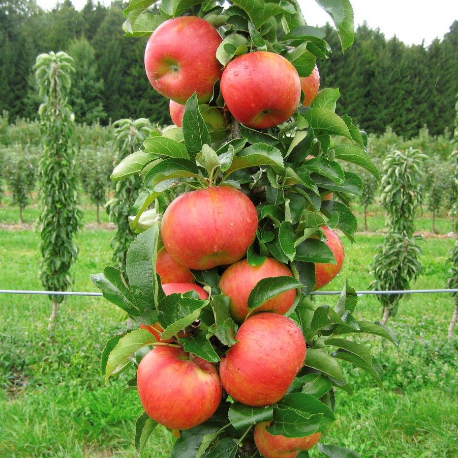 Саженцы колоновидной яблони ТРИУМФ принадлежит к зимостойким сортам. Дерево компактное, с аккуратной кроной, ветви тонкие, листва темно-зеленая, густая. Плодоношение наступает на 3 год после посадки. Плод средний, массой 150 г, шаровидной формы, красного оттенка с полосками, глянцевый, с плотной кожурой. Мякоть ароматная, ксило-сладкая на вкус, мелкозернистая.