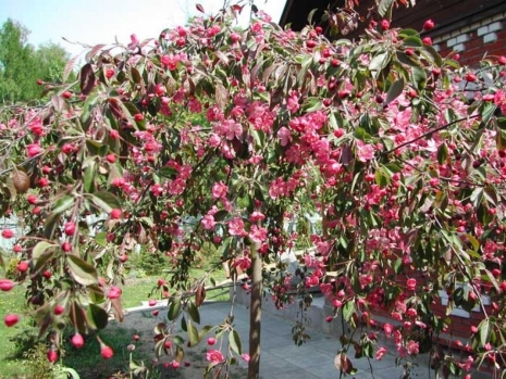 Деревья, относящиеся к разновидности Яблоня низкая плакучая, отличаются сравнительно небольшой, до 3.5 м. высотой. Также им свойственны поздние сроки начала вегетации и зацветания. Присутствие в тканях антоциана обуславливает специфический окрас не только коры и листвы, но также бутонов и лепестков раскрывшихся цветков.