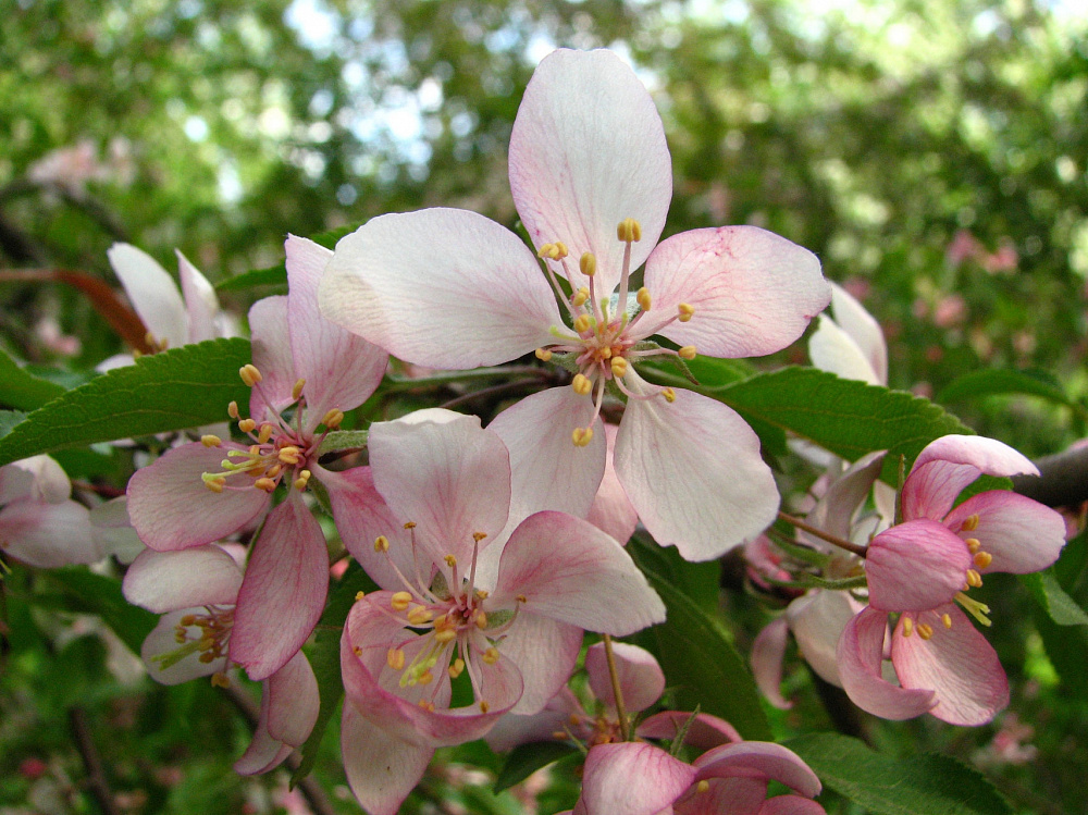 Бутоны у Яблони низкой карминового оттенка, соцветия образуют малоцветковые зонтики. Распустившиеся цветки бледно-малинового оттенка с примесью фиолетового, цветоножки длинные, тонкие.