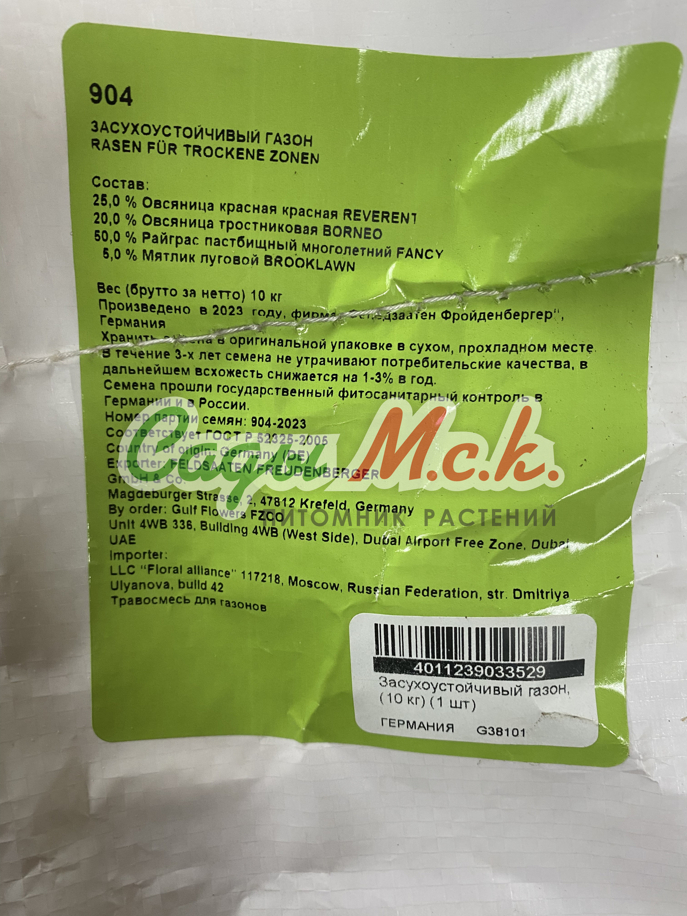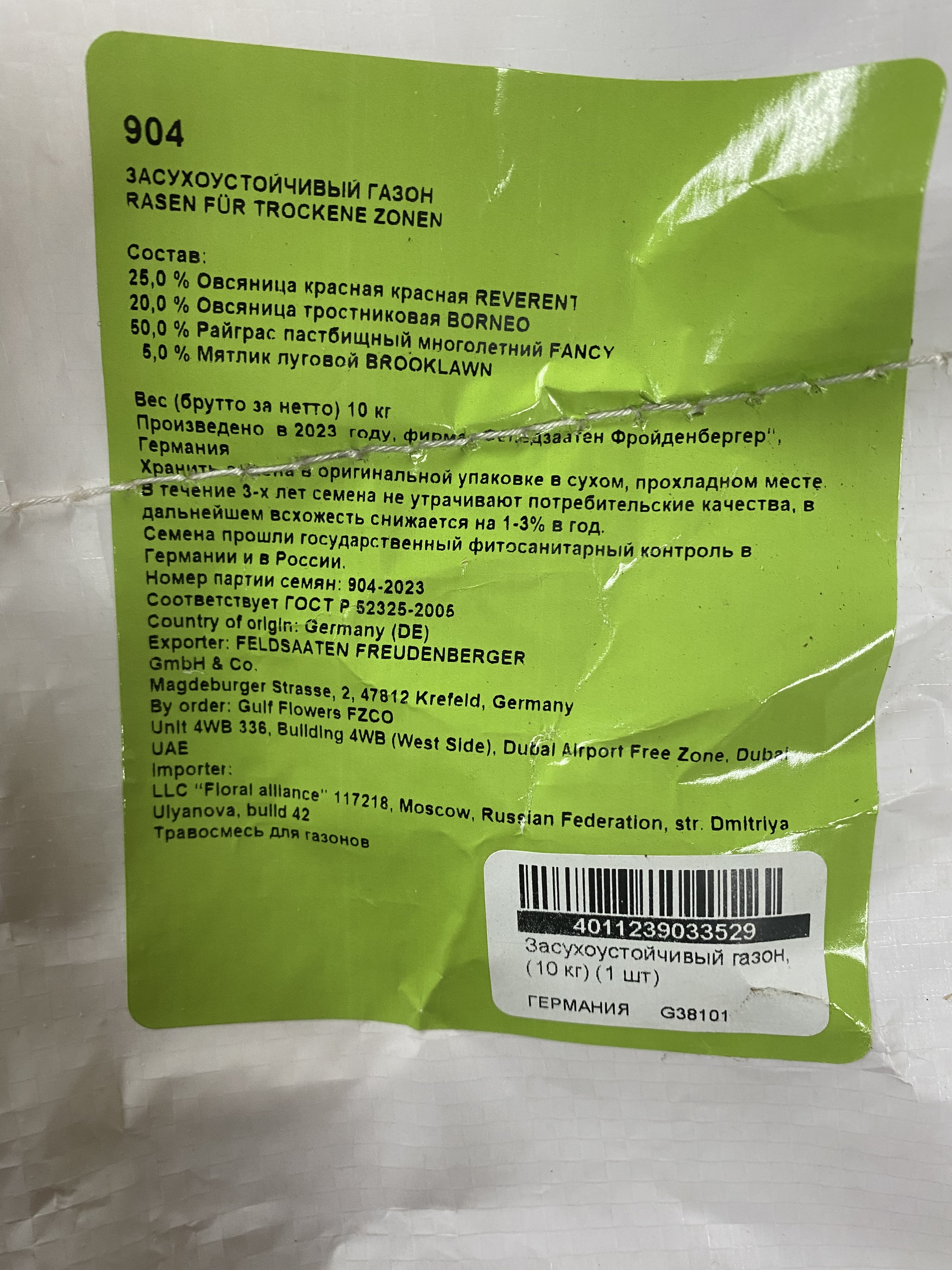 Состав: 25% Овсяница красная REVERENT, 20% Овсяница тростниковая BORNEO, 50% Райграс пастбищный многолетний FANCY, 5% Мятлик луговой BROOKLAWN. Производитель: Фельдзаатен Фройденбергер (FELDSAATEN FREUDENBERGER). Страна: Германия. Дата производства: 2023 г.