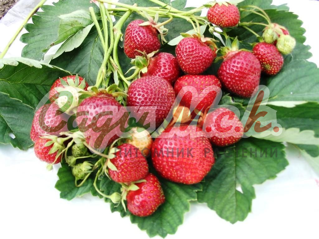 Саженцы земляники садовой Гирлянда принадлежат к ремонтантным сортам. Кустарник рослый, устойчивый к заболеваниям, отличается большой продуктивностью, формирует много цветоносов и усов, плодоношение осуществляется на образующихся розетка. Плод крупный, красивой формы, красный с плотной мякотью, обладающей удивительным ароматом земляники. Сорт земляники садовой Гирлянда плодоносит весь сезон, можно выращивать традиционным способом на грядках, либо в вертикальной культуре. Достоинства: зимостойкость, декоративность, десертный вкус и товарный вид ягод, транспортабельность.
