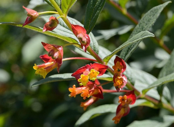 Куст густой, высотой 2-3 м и диаметром до 3 м. Растёт быстро, годовой прирост 35 см. Побеги дугообразно отклонённые. Листья длиной до 12 см, продолговато-яйцевидные, ярко-зелёные, слегка опушённые снизу. Цветки пятилепестковые, трубчатые парные, пазушные, густо железисто опушённые, жёлто-оранжевые с красноватыми прицветниками, расположены на прямостоячих цветоносах. Цветёт в июне. Плоды шаровидные, блестящие чёрные, несъедобные. Место солнечное или полутенистое. Почва плодородная влажная. Зона 4 (до -29°С). Хорошо переносит обрезку